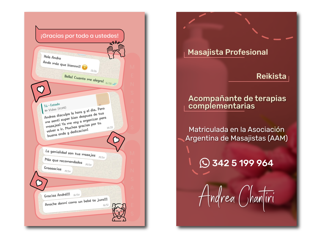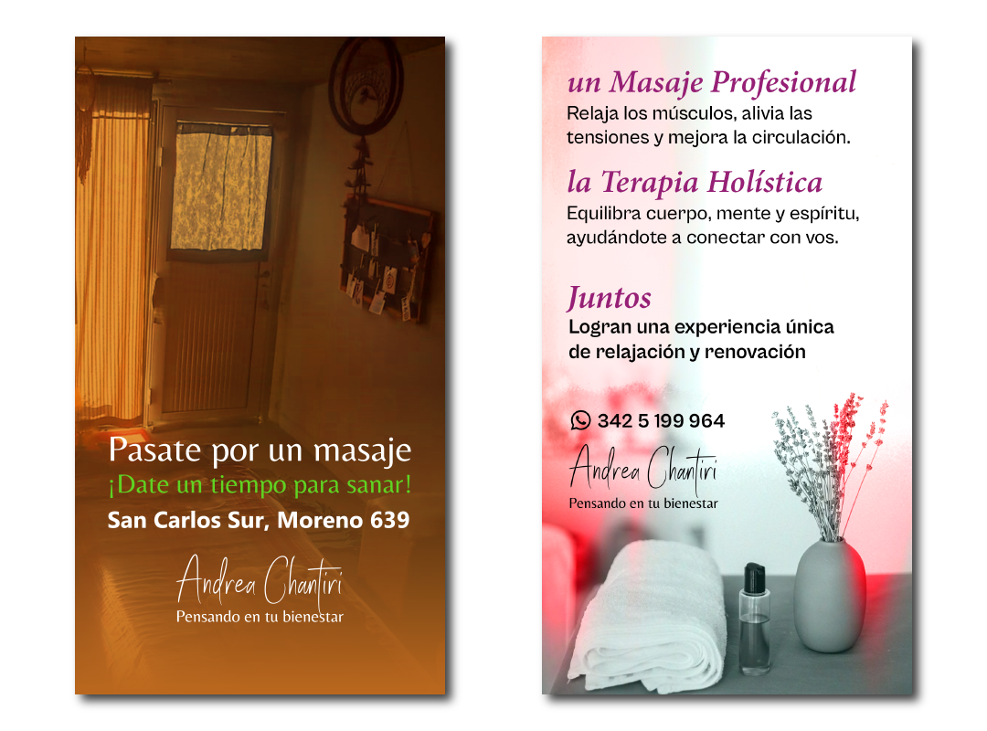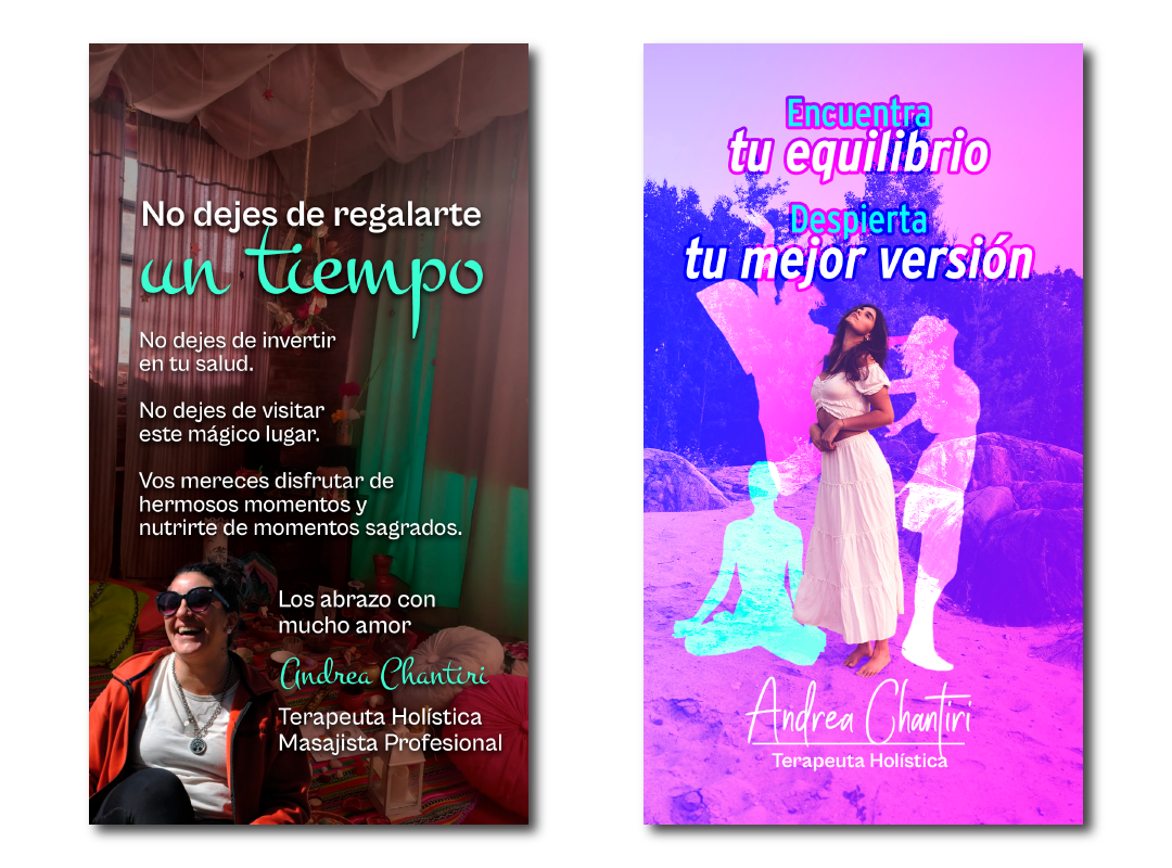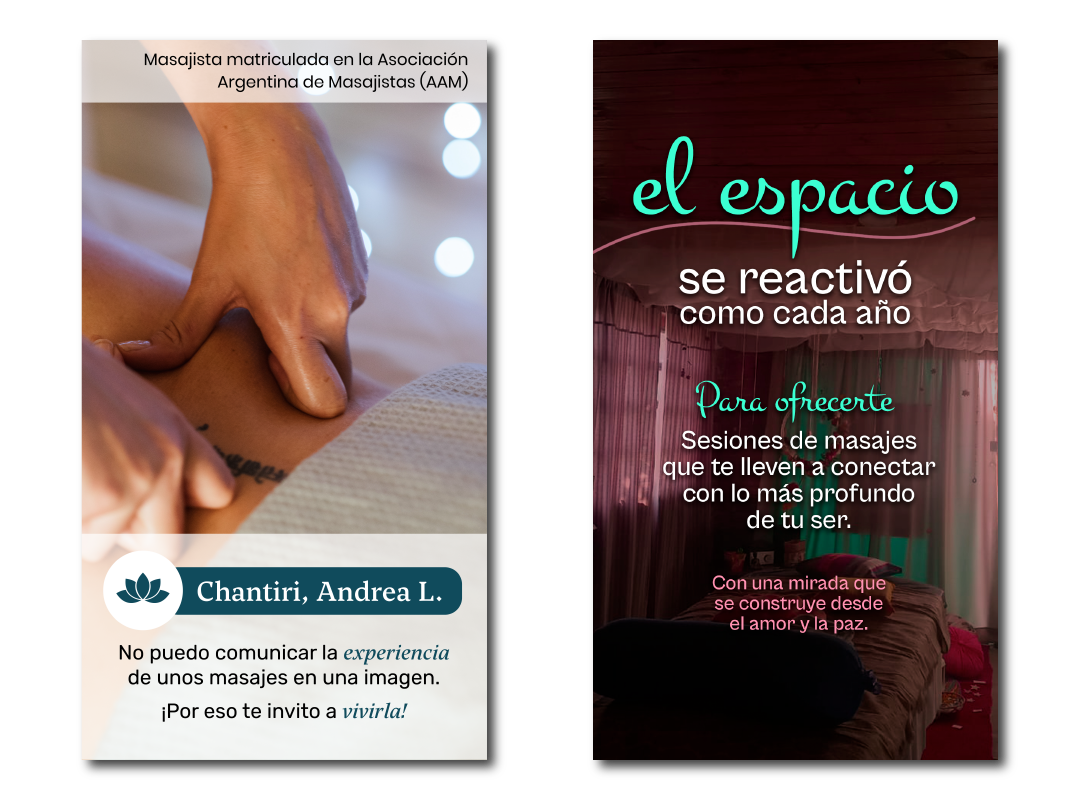 Diseñamos piezas gráficas para las redes sociales de Andrea Chantiri, masajista profesional, con un enfoque visual adaptable a su estilo y comunicación.