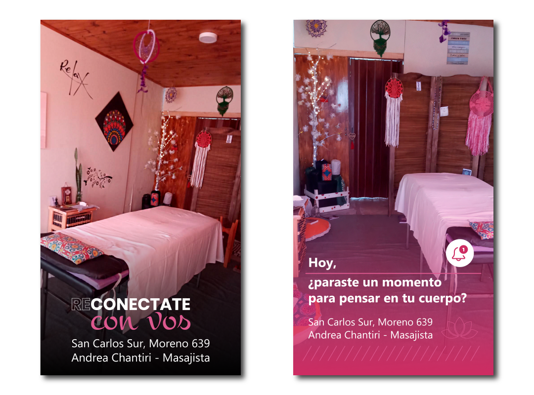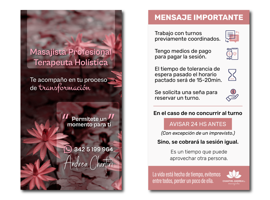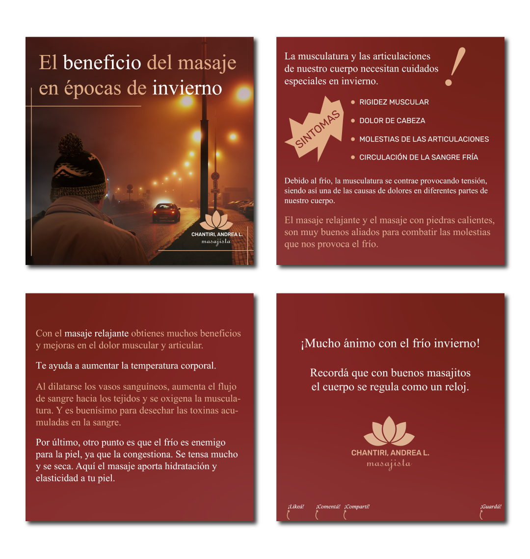Diseñamos piezas gráficas para las redes sociales de Andrea Chantiri, masajista profesional, con un enfoque visual adaptable a su estilo y comunicación.